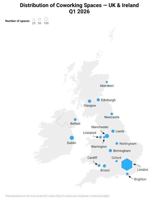 The report draws on proprietary CoworkingCafe data as of April 2026, analysing coworking inventory, median pricing and leading operators across the UK and Ireland’s largest markets.