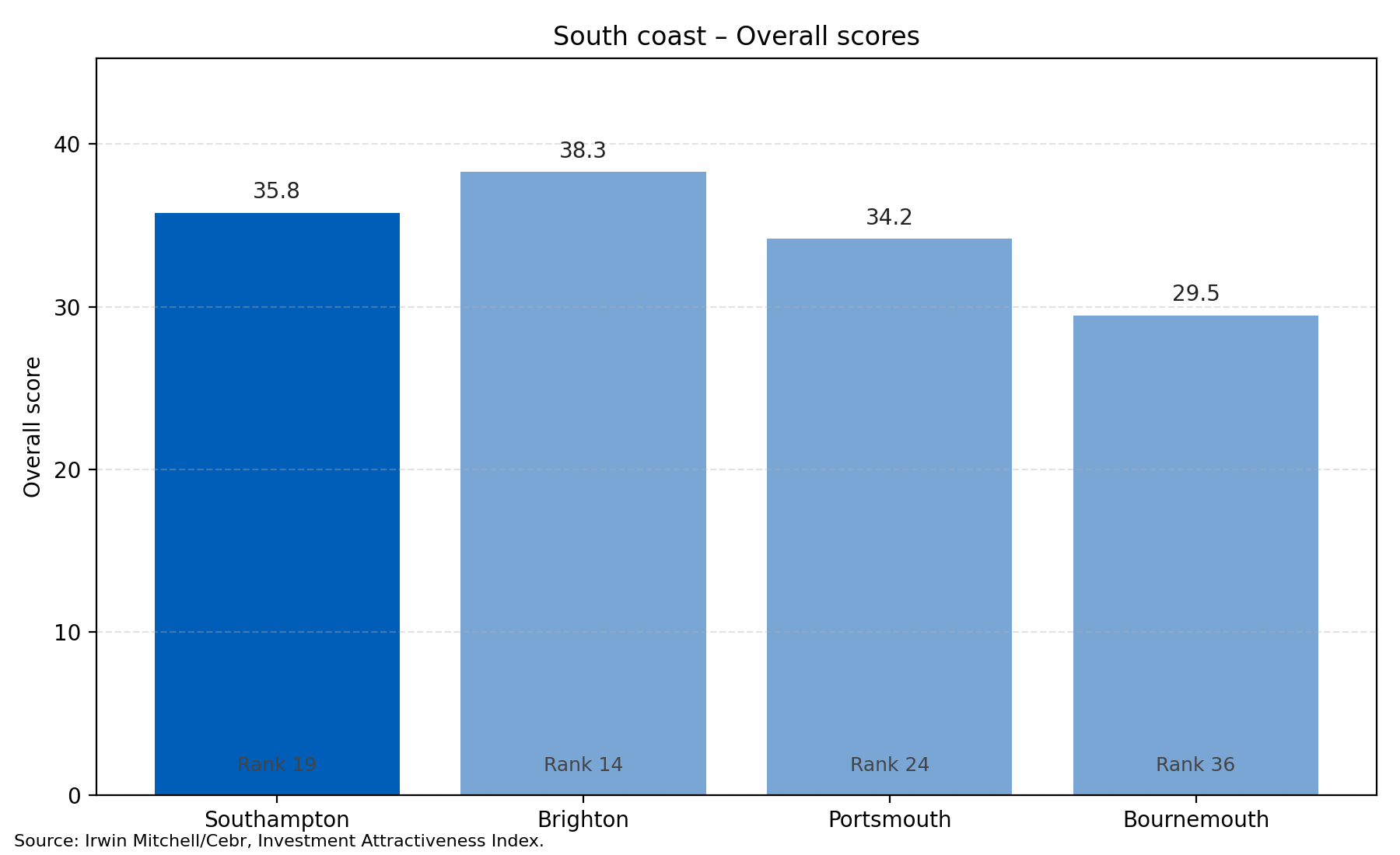 Elsewhere on the south coast, Southampton ranks 19th overall, supported by top‑ranked digital connectivity and improving skills; Portsmouth places 24th with strong infrastructure and online connectivity; and Bournemouth is 36th, with comparatively stronger growth potential. The report concludes that together, these results point to a region with deep talent and excellent connectivity, but new enterprise formation and targeted infrastructure investment will be critical to unlock the next wave of FDI.